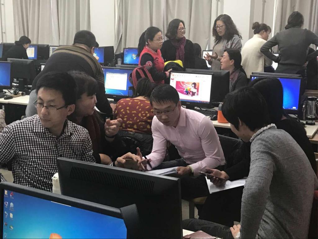 在两期分别为期三天的培训中,参培教师们牺牲休息日到校学校,晚上6、7点还在机房热烈讨论、交流,午间边吃盒饭边学习研究。我校教师们勤学好问,废寝忘食,刻苦努力的精神得到了培训指导教师的赞许。许多没报名的教师也参加了学习,80多人的机房座无虚席。培训中指导教师对微课设计理念、微课制作的基本方法和手段等以实际案例的方式进行了讲解。同时对教学实践中利用APP对学生的学习状态、学习效果以及学生的学习成果评价等的使用方法进行了现场操作演练。参培教师们以团队方式提交了作品成果进行现场展示,指导教师对每一个作品进行了耐心细致的点评和指导。